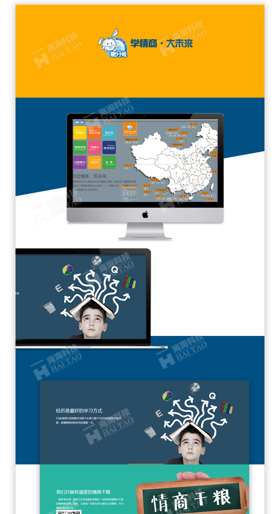 该网站建设的是一个教育培训网站,网站采用色调是蓝色为主,黄色为辅,白色为背景颜色设计而成的,鼠标滚动页面时,导航栏固定在顶部不动,这种设计会减少用户的跳出率,增大品牌的曝光率。banner配图展示了龅牙兔在全国的教育试点,以及免费体验课程等。同时banner图下方设计了对应的描述类的文字,增加了用户对于banner图的理解。整个页面采用了动画特效等形式设计,为页面增加了动感。