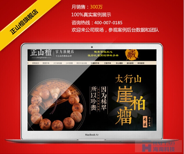 与正山檀达成一致意见之后,正山檀被重新定位成高档且性价比优的佛珠品牌,与市场同质化商品形成差异化卖点,目标客户群体较之以前更广泛。接着,海淘科技电商7人组成的托管服务团队进行了分工协作,美工根据商品属性与广泛的市场调查,进行了店铺装修,将店铺打造成古色古香的,清幽典雅的古玩世界。既烘托了“佛珠品牌店”这一主题又给人眼前一亮、耳目一新的感觉!