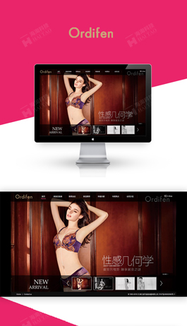 欧迪芬内衣网站建设案例,该网站是采用目标群众的喜爱的枚红色为辅助,和流行摄影图片为背景设计。鼠标悬停在导航栏上时会出现下拉菜单框,以主色调为背景色。网页的banner图是以上海东方明珠为背景图,加上公司产品的宣传标语“性感几何学”。