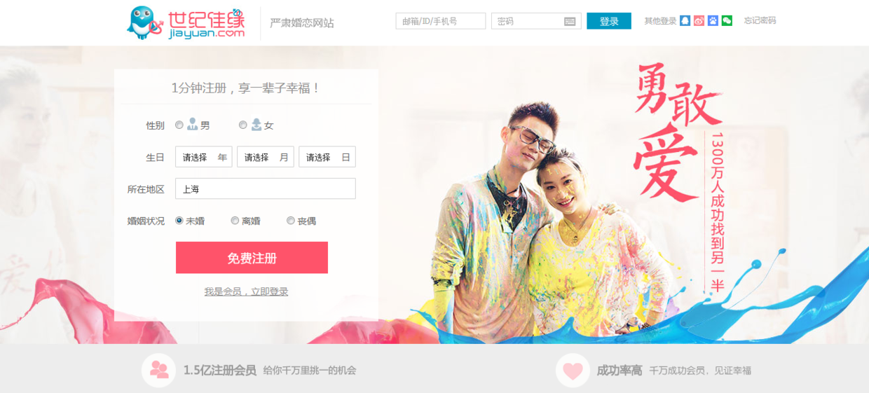 金钱:人人都喜欢免费。让用户知道,注册我的产品你不需要花一分钱。世纪佳缘做为婚恋交友网站,可能给用户的印象是“如果我使用它,应该是要交钱的”。在注册时,以醒目的文案告知用户注册我们不花钱,可以诱导一部分心存疑虑的用户注册。