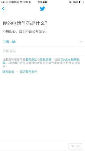 这里的安全是指用户隐私的安全,而不是指人身安全。每个人都收到过垃圾短信、推销电话,这让我们不胜其烦。通常我们接到这个短信电话时都会默念一句“不知道谁又把我的信息给卖了”。在注册中以友好的方式告知用户隐私会得到尊重,会让注册流程开启的更加容易。在这方面,国外的产品做的相对比国内好一些,可能是因为国外更加注重保护隐私。在注册中让用户打消顾虑,Twitter和tinder是两个很好的榜样。
