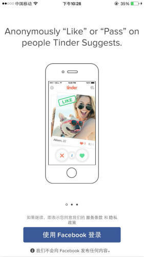 tinder使用Facebook账户登录,这里强调tinder不会向Facebook发布任何内容,打消用户的顾虑。因为用户可能不太想让好友知道自己使用了一个交(yue)友(pao)软件
