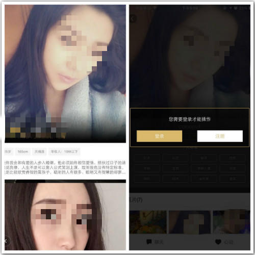 某些内容型应用可以允许用户在未登陆状态下浏览一部分信息,如果用户想要进行某些操作则必须登陆。这样可以通过内容运营技巧让用户产生登陆的冲动和需求,从而诱惑用户进行注册。这是一款交友应用,用户进入应用后可以看到非常漂亮的女生信息,用户想与女生沟通时会提示用户进行登录或注册。人性中的贪、色会推动用户注册。我相信,首页推荐的女生一定是运营MM精心挑选的。
