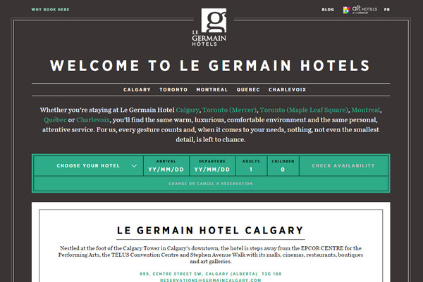 同样是酒店的网站,Le Germain酒店的官网设计更加扁平,这种方正无比、凸显排版的设计让整体显得更加奢华。网站的整体结构稳定,细致的排版营造出一种精致而值得信任的氛围。