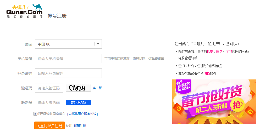 用户来到注册页面后,需要途径多个步骤流程,最终完成注册的方式,以天猫、携程、途牛的注册流程为例。
