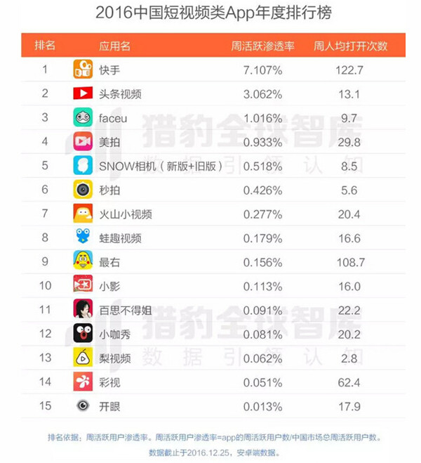 短视频排行榜上,除了经典的快手、秒拍和美拍,其它几乎都是新的app,第13名梨视频在11月才刚刚发布。在年初,Faceu以32倍的涨幅登上猎豹全球智库的2月涨幅榜首,虽然之后短视频的爆发被直播app截胡,到了年末,短视频app又一次占据主流。