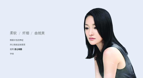 转折的差异在于曲直,转折越尖锐的字体适合表达力量感,反之曲面转折的字体适合表现女性的柔美。见下面两个例子