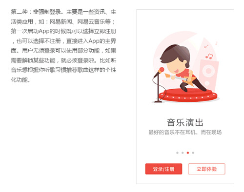 第一种:无需登录,直接使用app的功能,主要是工具类的app,如日历、计算器、手电筒之类的app,不够现在这样纯粹的app几乎不存在,因为没有用户存留的app就没有价值,没有经济价值就会不下去啊,所以市场上没有这样的活雷锋了,都被系统应用取代了。二工具类的app为了不被系统应用取代,就想办法提供一些个性功能吸引用户注册。