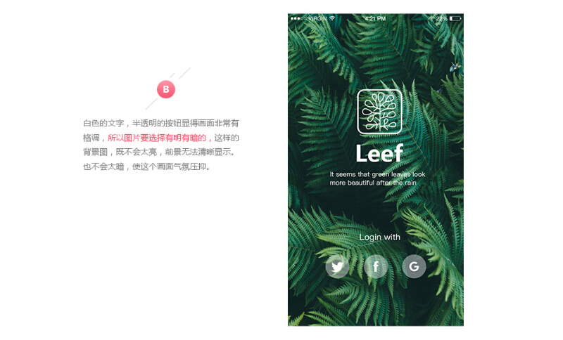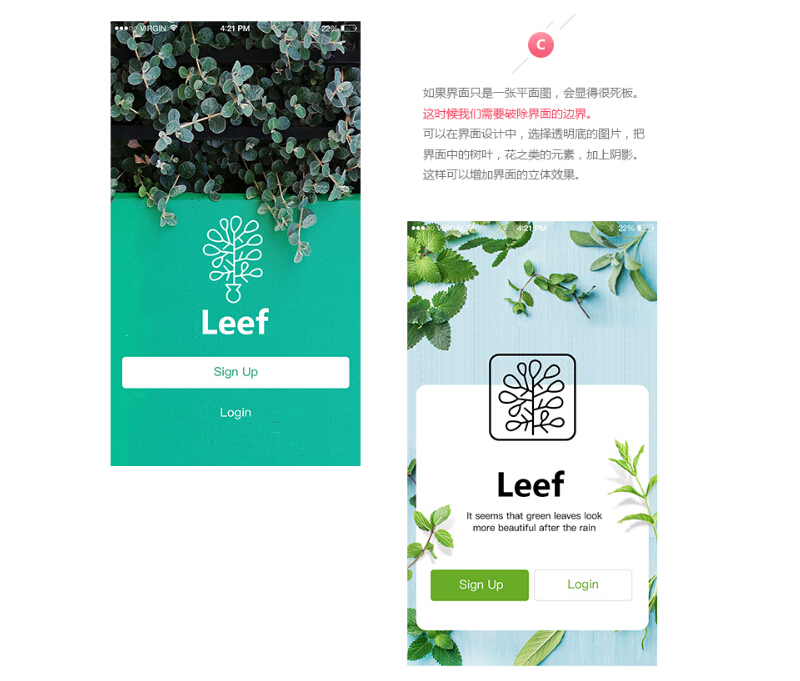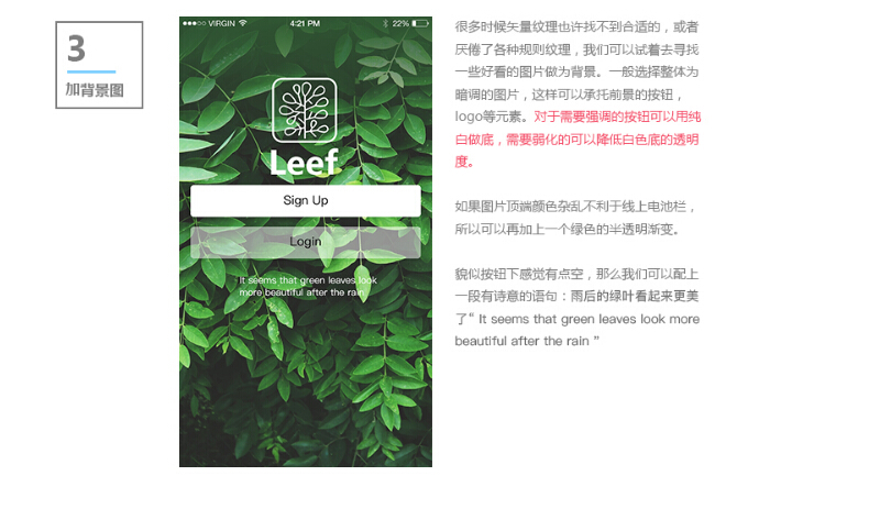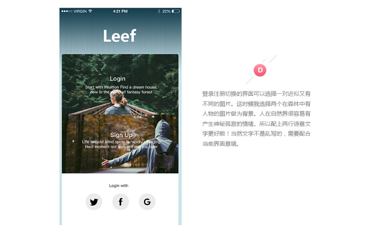 视觉设计前先理清楚界面的逻辑,界面中每个元素的点击从哪里来到哪里去。app因为产品账号体系不同的,所以有各种登录注册方式。登录注册有四种方式。每种方式可以采用不同的形式的背景图设计。找图片有意识的按不同类型分类去寻找图片。要善于运用一些透明地图片调节界面的维度。让界面细节设计更丰富。设计师也要学会运用文字的力量,点睛的文字可以让界面设计增加品质感。