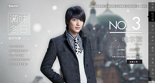 伴随气温节节降温,森马最新冬季营销活动不畏低温强档上线!调味冬日城市PK赛活动正式启动,创意调配每座城市的独特味道,无论是激发古城的摇滚味、酝酿弄堂的浪漫情怀、或是撞击冰雪中的童话火花,都让流行前沿的人群,根据自己的城市魅力,用森马新品调配出时尚味道。