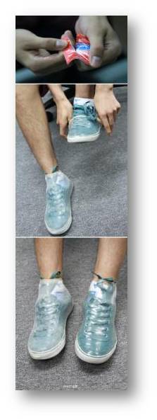 电话响起,503的内容团队的同事说:“老金,我们想了好玩的东西,下来看一眼。”下楼,看到打开的两只杜蕾斯,以及杠子脚上套着东西。好奇地问:“啥东西?折腾什么呢?”内容团队的人围上我说:“有趣的东西,杜蕾斯套鞋防止被淋湿。”于是大家七嘴八舌地解释起来为什么这样做。我联想起小时候出门用塑料袋套鞋的过去,嗯,避孕套有弹性更适合,何况我们用的还是凸点的,增加了防滑功能。