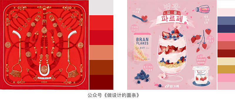 左边是大面积的红色搭配少许相近色或邻近色显得很高档耐看;右边是大面积的粉嫩色系搭配少于红色和蓝紫色,冷暖搭配,俏皮又耐看。