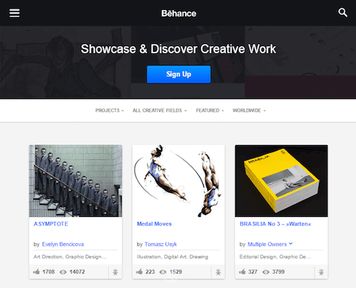 同样的规则适用于网站。 如果您看看下面的Behance示例,首先要注意的是“注册”号召性用语按钮。 在这种情况下,颜色和位置比文本更重要。