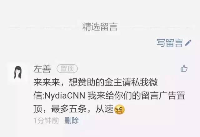 此前,微信公众平台上线留言置顶功能,留言被精选并置顶后,将显示于评论区首位,对于千万大号而言,评论区首位的曝光量确实值得期待。不少小编们纷纷感慨“这或许是一个具有无限潜力的广告位啊!”