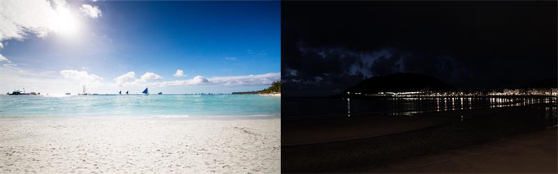 大家看完后是什么感觉呢?左边的沙滩是不是感觉很热辣阳光看着就很热?而右边的黑夜感觉很宁静神秘遥不可及?