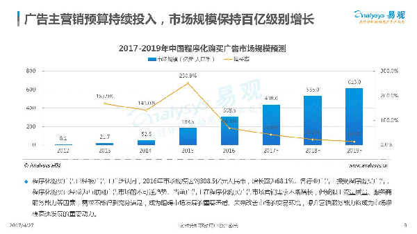 网络广告市场逐渐成熟、流量红利消失,导致市场规模增速放缓,互联网广告运营商需要通过程序化购买广告交易提升广告库存的变现能力。程序化购买广告已经被广告主广泛认同,2016年市场规模达到308.5亿元人民币,增长率为68.1%。各行业广告主接受程序购买广告,程序化购买已经成为互联网广告市场的不可逆趋势。
