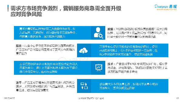 当前广告主在程序化购买广告市场营销需求不断增长,但受限于流量质量、服务商服务能力等因素,需求不能得到充分满足,成为阻碍市场发展的重要矛盾。未来改善市场的交易环境,提升营销服务能力将成为市场规模高速发展的重要动力。
