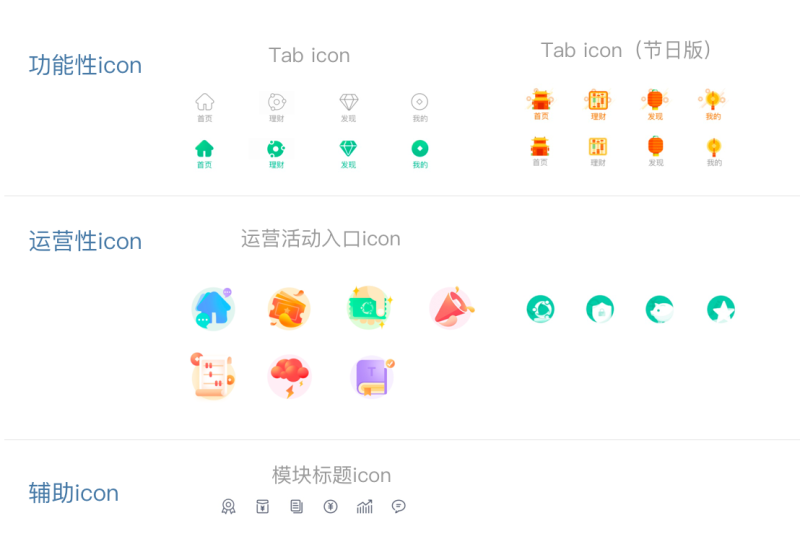 Light字体相信许多设计师曾经使用过,确实可以让界面显得轻盈纤巧,但对于需要阅读信息的用户来说,就没有加粗之后的字体那么友好易读了,所以我们也可以看到在现在的中文设计趋势中,大家更多的会去实用regular为初始的文字量级,Medium作为加粗的量级了,这也是信息为王在设计趋势中的一种体现吧。其他的方法例如增加留白,把重要的信息凸显出来。最后在icon的使用上,可以参考下图我们对于icon的分类定义。