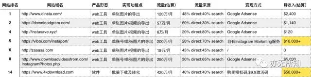 在这个案例中,我将关键词排名前两页的工具站进行了梳理,通过下面的表格, 发现Instagram pictures download这个极其细分的市场每个月能贡献10万美元左右的利润!
