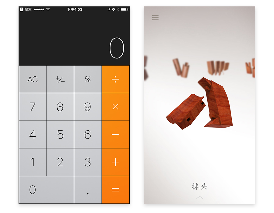 常见于系统自带的工具类APP,像经常使用的闹钟、日历、计算器等等;一些简单的第三方APP:乐流,榫卯等。