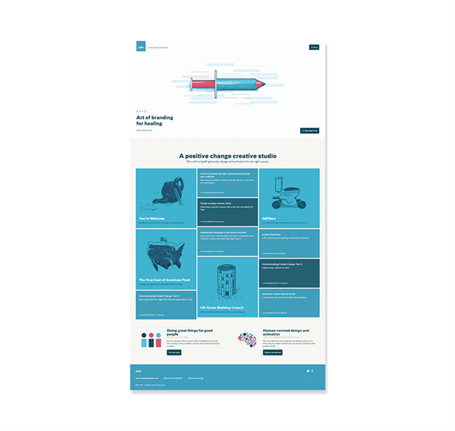 页面中的蓝色作为背景色的同时阴影部分显出了图片内容轮廓,制造出朦胧的视感,反白的文字更易于阅读:
