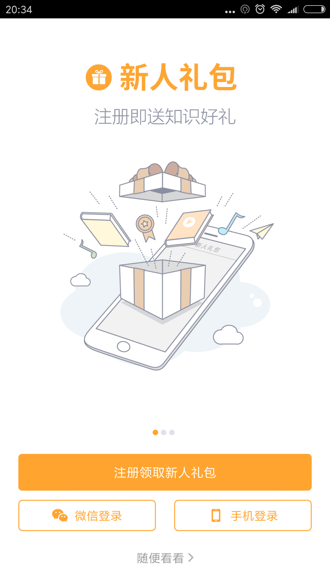 第二种,产品还是会引导你进行注册登录、但是还是同时提供了一个“随便看看”的入口,用户可以不需要进行注册登录便可以使用产品。直到用户需要使用到一些带有“个人属性”的产品功能时,才会提示用户去进行注册登录。