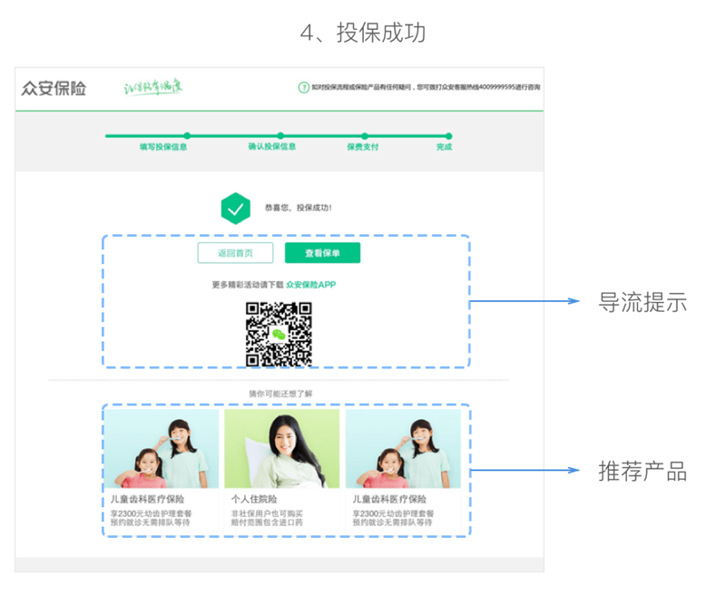 投保成功页则进一步完善了导流信息及同类产品推荐功能,为用户提供了更明确的可前往路径。