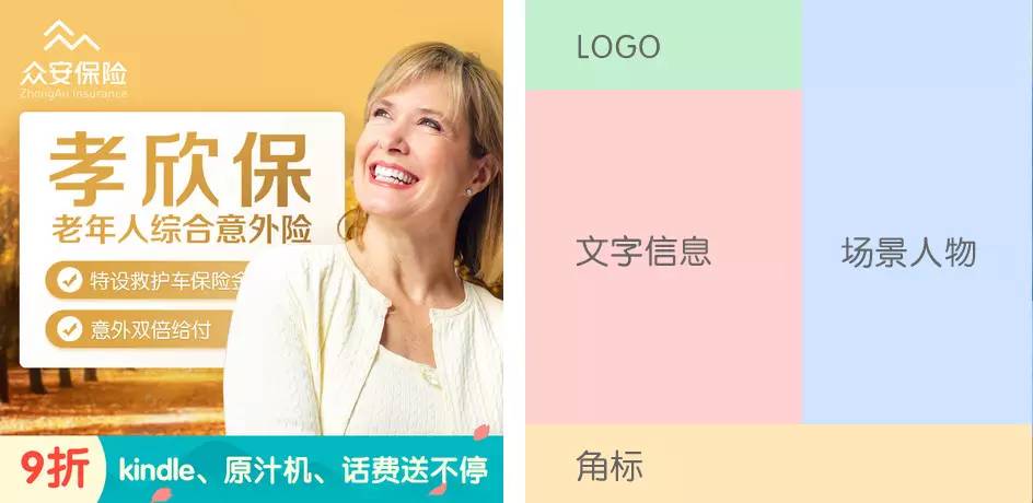主要由文字说明信息、烘托气氛的场景和人物图片、运营性质的角标和底标(可选)、公司logo,这四个主要部分组成。