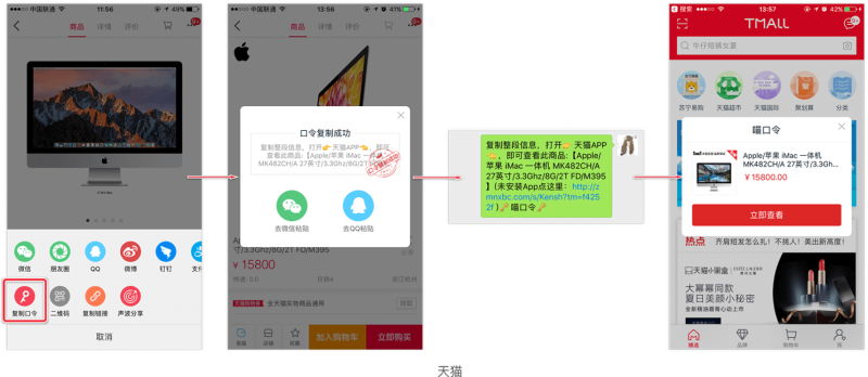同时也可以用于链接的分享。比如天猫和淘宝的商品链接,由于众所周知的原因,天猫和淘宝的链接无法在微信中直接打开,但微信这么大的传播途径阿里也是必然不会放掉的,于是天猫和淘宝就有了一套独有的分享机制:淘口令。用户分享出来的是带链接和说明的文本,复制文案后,打开对应的APP,即可自动识别链接并提示打开对应的商品详情页。