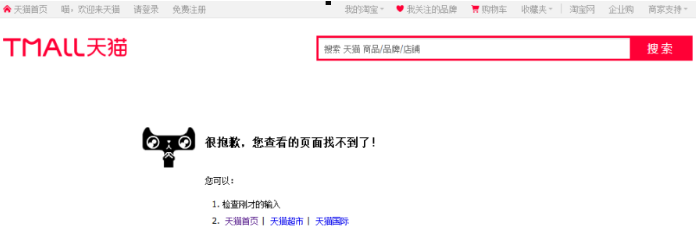 满足这个需求也很简单,一般来说,给用户返回上一页、返回首页的链接即可,有的网站会自动帮助用户返回首页,有的网站会提供更多内容,这可以视具体情况而定。比如像天猫这样:
