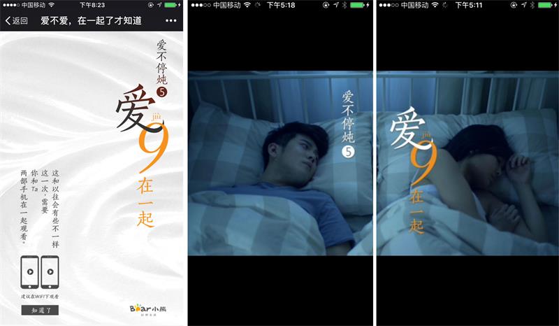 一个关于爱情的视频,需要使用2台手机才能看到完整的内容,视频会在2台手机上同步播放。和心爱的TA一起把手机拼起来看吧。我觉得这个h5在只有一个手机观看的时候,应该提供一个滑动屏幕或转动手机时可以看到另一半视频的功能。