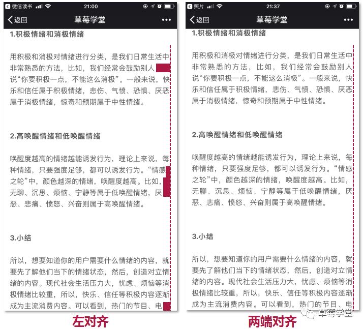还有一个和左对齐很类似的对齐方式:两端对齐,相比于左对齐,两段对齐的文字边缘更整齐,视觉效果更好,所以,在新媒体营销技巧——新媒体排版中一般用两端对齐代替左对齐: