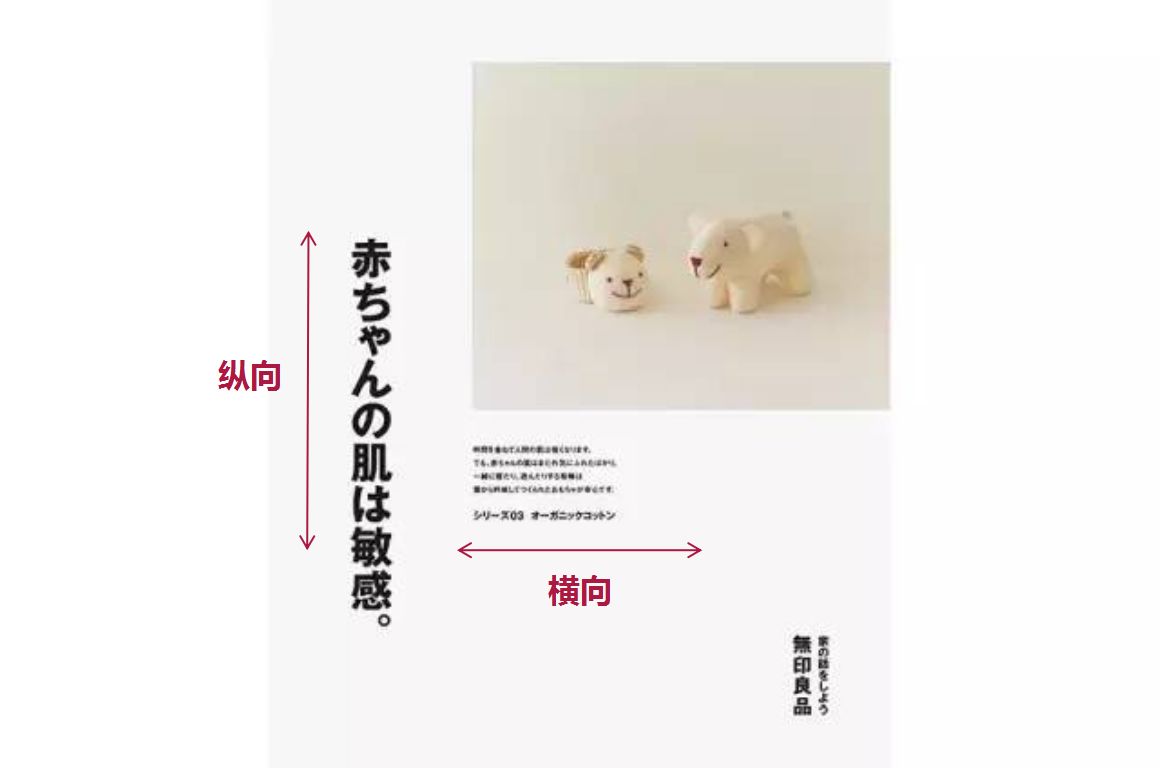 比如,无印良品的海报看着很简单,实际上他们的设计师很擅长利用对比,使得简单的画面充满设计感,下图就很好地利用了文字横向和纵向分布的对比,打破了平淡: