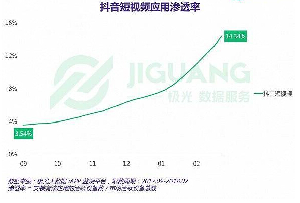 极光大数据的监测结果显示,截至今年2月份最后一周,抖音短视频的市场渗透率达到14.34%。这意味着市面上每100台活跃终端中,就有超过14台安装有抖音短视频应用。值得注意的是,抖音短视频的渗透率在过去半年中实现了非常显著的增长,与期初相比增长比例超过300%。