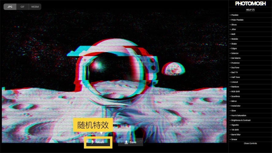 PhotoMosh 一共提供了27种故障特效,如果你有选择困难,点击下方的随机按钮「MOSH」就能一键把你的屏幕摔坏啦:
